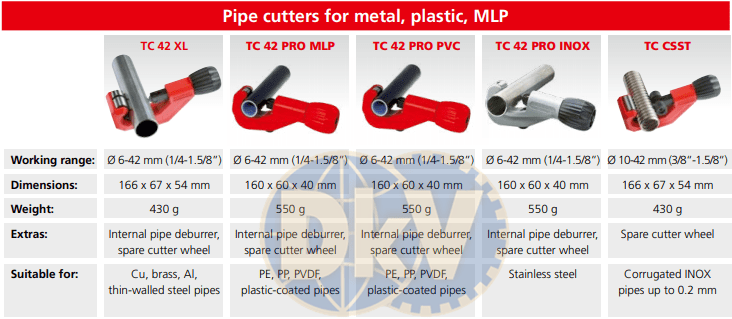- Cắt ống Rothenberger TC CSST, Rothenberger pipe cutters TC CSST có đường kính: Ø 10 - 42 mm, sử dụng bánh (đĩa cắt) chuyên dùng để cắt các loại ống trong công nghiệp.