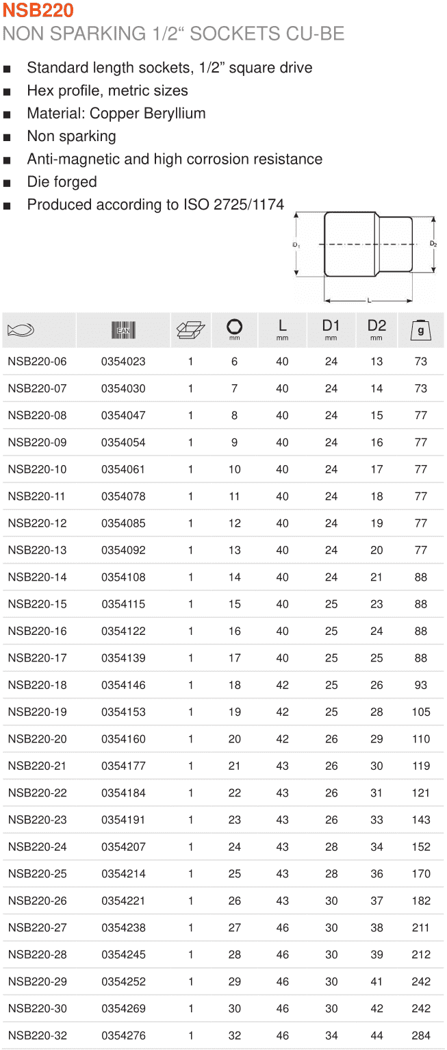 - Khẩu chụp bulong chống cháy nổ Bahco NSB220-10 (đầu chụp bulong chống cháy nổ Bahco NSB220-10) có đầu vào 1/2", size đầu ra: 10 mm, chuyên dùng trong môi trường phòng chống cháy nổ. Đầu chụp bulong chống cháy nổ Bahco NSB220-10 được chế tạo từ hợp kim đồng/bery (Cu Be).