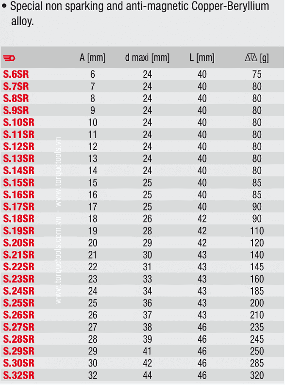 - Khẩu chụp bulong chống cháy nổ Facom S.6SR (đầu chụp bulong chống cháy nổ Facom S.6SR) thuộc loại 12 cạnh, có đầu vào 1/2", size đầu ra: 6 mm, chuyên dùng trong môi trường phòng chống cháy nổ. Đầu chụp bulong chống cháy nổ Facom S.6SR được chế tạo từ hợp kim đồng/bery (Cu Be).