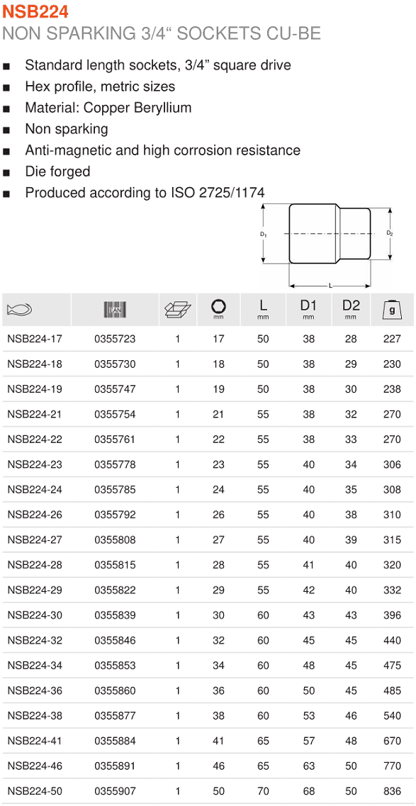 - Khẩu chụp bulong chống cháy nổ Bahco NSB224-17 (đầu chụp bulong chống cháy nổ Bahco NSB224-17) có đầu vào 3/4", size đầu ra: 17 mm, chuyên dùng trong môi trường phòng chống cháy nổ. Đầu chụp bulong chống cháy nổ Bahco NSB224-17 được chế tạo từ hợp kim đồng/bery (Cu Be).