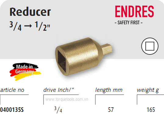 - Khẩu chuyển đổi chống cháy nổ Endres 0400135S, Endres non sparking reducer 0400135S có đầu vào 3/4", size đầu ra: 1/2", chiều dài: 57 mm, chuyên dùng trong môi trường phòng chống cháy nổ.