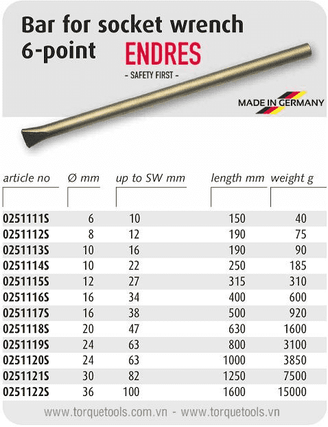 - Tay công chống cháy nổ Endres 0251115S, Endres non sparking bar for socket wernch ended 0251115S là loại thanh dài đầu 2 cạnh cắm vào khẩu chữ T, có size đầu: 12 mm, chuyên cắm vào khẩu chữ T: 27 mm. Tay công chống cháy nổ Endres 0251115S không gây phát sinh tia lửa khi sử dụng trong môi trường phòng chống cháy nổ.