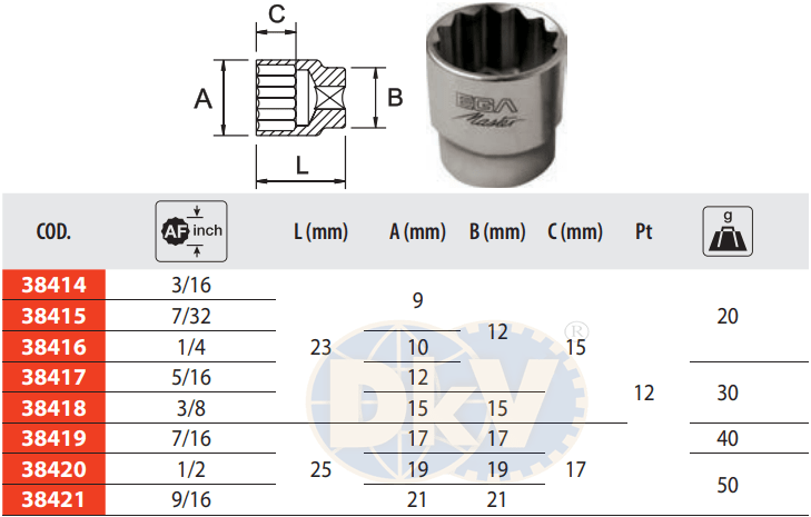 - Khẩu chụp bulong Inox Egamaster 38419 (đầu chụp bulong Inox Egamaster 38419) có đầu vào 1/4", size đầu ra 12 cạnh: 7/16", chuyên dùng để siết bulong, đai ốc, trong môi trường yêu cầu sạch sẽ (thực phẩm, y tế, phòng lab).
