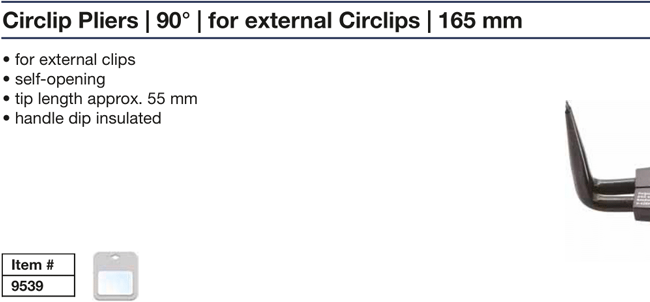 - Kìm banh BGS 9539, BGS circlip pliers 9539: chuyên dùng để banh các vòng đệm, vòng lót, cá chặn.. phổ biến trong lắp ráp, bảo dưỡng công nghiệp. Khả năng banh: Ø 55 mm, chiều dài: 165 mm.