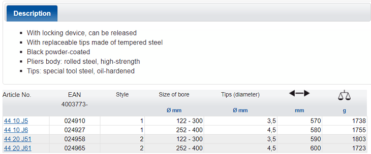 - Kìm banh Knipex 44 10 J5, Knipex circlip pliers 44 10 J5 chuyên dùng để banh các vòng đệm, vòng lót, cá chặn.. phổ biến trong lắp ráp, bảo dưỡng công nghiệp. Khả năng banh: Ø 122 - 300 mm, đường kính ty đầu kìm: Ø 3.5 mm.