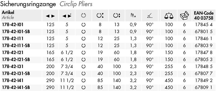 - Kìm banh NWS 178-42-I31, NWS circlip pliers 178-42-I31: chuyên dùng để banh các vòng đệm, vòng lót, cá chặn.. phổ biến trong lắp ráp, bảo dưỡng công nghiệp. Khả năng banh: Ø 40 - 100 mm, đường kính ty đầu kìm: Ø 2.3 mm.