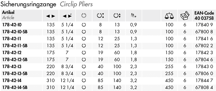 - Kìm banh NWS 178-42-I4-SB, NWS circlip pliers 178-42-I4-SB: chuyên dùng để banh các vòng đệm, vòng lót, cá chặn.. phổ biến trong lắp ráp, bảo dưỡng công nghiệp. Khả năng banh: Ø 85 - 140 mm, đường kính ty đầu kìm: Ø 3.2 mm.