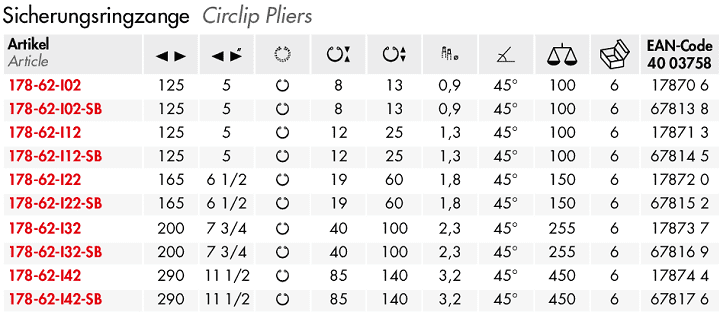 - Kìm banh NWS 178-62-I22, NWS circlip pliers 178-62-I22: chuyên dùng để banh các vòng đệm, vòng lót, cá chặn.. phổ biến trong lắp ráp, bảo dưỡng công nghiệp. Khả năng banh: Ø 19 - 60 mm, đường kính ty đầu kìm: Ø 1.8 mm.