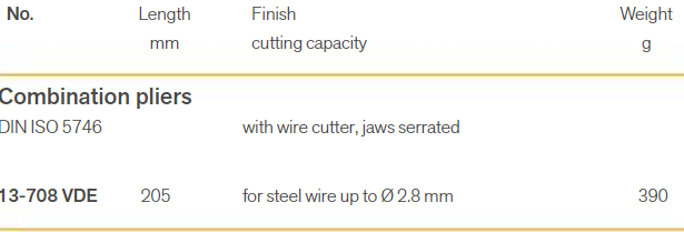 - Kìm cách điện đa năng Bernstein 13-708 VDE, Bernstein VDE Combination Pliers 13-708 VDE với nhiều ứng dụng: cắt, uốn, kẹp, siết...phổ biến trong môi trường điện cao thế. Khả năng cắt với dây Ø 2.8 mm.
