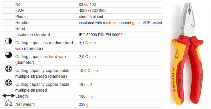- Kìm đa năng cách điện Knipex 03 06 160, Knipex VDE combination plier 03 06 160 với nhiều chức năng chính như: kẹp, uốn, cắt. Khả năng cắt với dây cứng Ø 2 mm, dây cáp đồng nhiều sợi Ø 10 mm....phổ dụng khi thi công trong môi trường điện cao thế < 1000 V.
