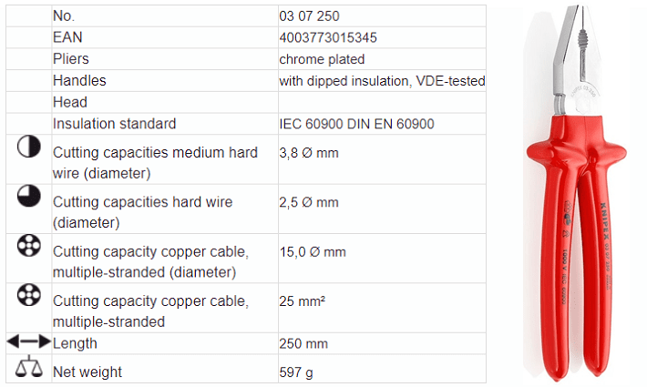 - Kìm đa năng cách điện Knipex 03 07 250, Knipex VDE combination plier 03 07 250 với nhiều chức năng chính như: kẹp, uốn, cắt. Khả năng cắt với dây cứng Ø 2,5 mm, dây cáp đồng nhiều sợi Ø 15 mm....phổ dụng khi thi công trong môi trường điện cao thế < 1000 V.