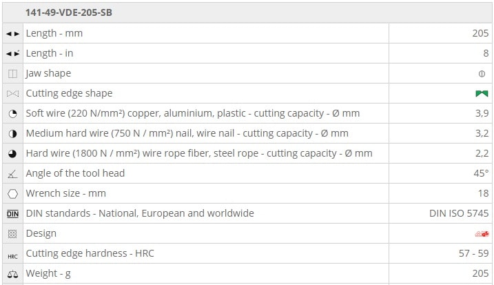 - Kìm cắt NWS 141-49-VDE-205-SB, NWS cutting pliers 141-49-VDE-205-SB chuyên dùng để cắt các chi tiết phổ biến trong công nghiệp. Khả năng cắt cắt với dây mềm Ø 3.9 mm, dây cứng Ø 2.2 mm.