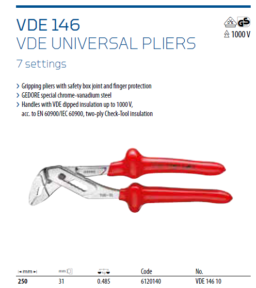 - Kìm mỏ quạ cách điện Geodre VDE 146 10, kìm bơm nước cách điện Geodre VDE 146 10 chuyên dùng để siết ống, các chi tiết hình trụ tròn...trong môi trường điện cao thế 1.000 V, có độ mở max: 31 mm,chiều dài 250 mm.