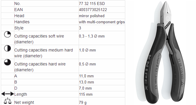 - Kìm cắt chống tĩnh điện Knipex 77 32 115 ESD, Knipex ESD cutting pliers 77 32 115 ESD chuyên dùng để cắt các chi tiết phổ biến trong môi trường có từ tính cao. Khả năng cắt với dây cứng Ø 0.5 mm, dây cáp mềm Ø 0.3 - 1.3 mm.
