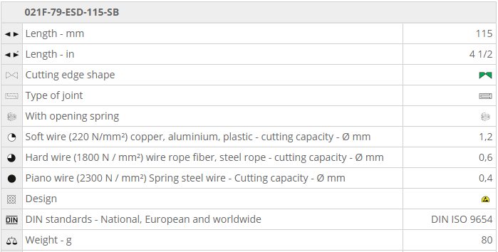 - Kìm cắt chống tĩnh điện NWS 021F-79-ESD-115-SB, NWS Side Cutter ESD 021F-79-ESD-115-SB chuyên dùng để cắt các chi tiết phổ biến trong môi trường có từ tính cao. Khả năng cắt với dây mềm Ø 1.2 mm, dây cứng Ø 0.6 mm, dây piano Ø 0.4 mm.