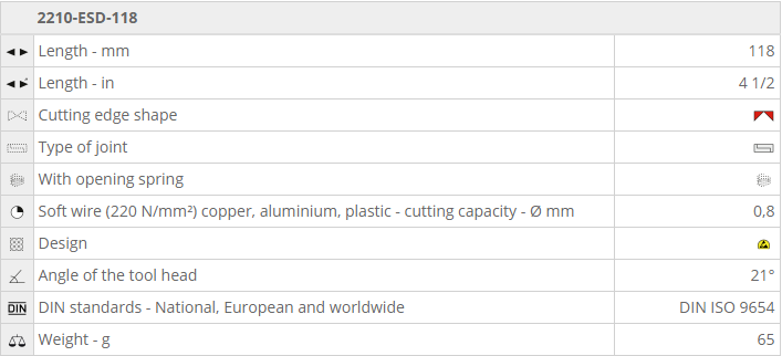 - Kìm cắt chống tĩnh điện NWS 2210-ESD-118, NWS Side Cutter ESD 2210-ESD-118 chuyên dùng để cắt các chi tiết phổ biến trong môi trường có từ tính cao. Khả năng cắt với dây mềm Ø 0.8 mm .