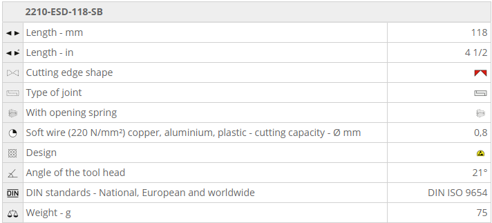 - Kìm cắt chống tĩnh điện NWS 2210-ESD-118-SB, NWS Side Cutter ESD 2210-ESD-118-SB chuyên dùng để cắt các chi tiết phổ biến trong môi trường có từ tính cao. Khả năng cắt với dây mềm Ø 0.8 mm .