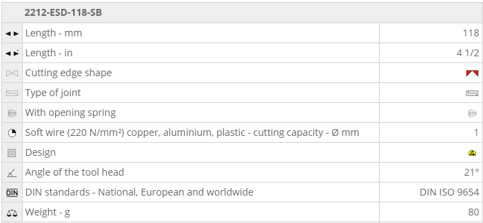 - Kìm cắt chống tĩnh điện NWS 2212-ESD-118-SB, NWS Side Cutter ESD 2212-ESD-118-SB chuyên dùng để cắt các chi tiết phổ biến trong môi trường có từ tính cao. Khả năng cắt với dây mềm Ø 1 mm .