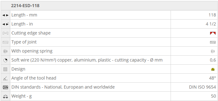 - Kìm cắt chống tĩnh điện NWS 2214-ESD-118, NWS Side Cutter ESD 2214-ESD-118 chuyên dùng để cắt các chi tiết phổ biến trong môi trường có từ tính cao. Khả năng cắt với dây mềm Ø 0.6 mm .