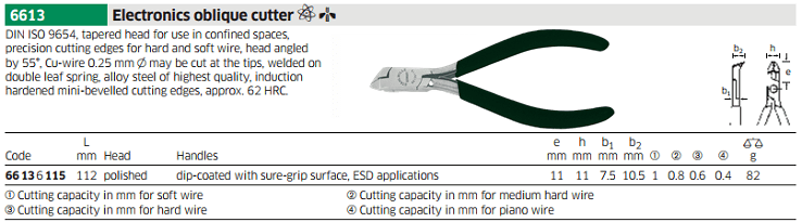 - Kìm cắt chống tĩnh điện Stahlwille 66136115, Stahlwille esd side cutter pliers 66136115 chuyên dùng để cắt các chi tiết phổ biến trong môi trường có từ tính cao. Khả năng cắt với dây cáp mềm Ø 1 mm.
