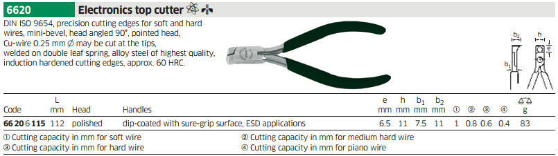 - Kìm cắt chống tĩnh điện Stahlwille 66206115, Stahlwille esd side cutter pliers 66206115 chuyên dùng để cắt các chi tiết phổ biến trong môi trường có từ tính cao. Khả năng cắt với dây cáp mềm Ø 1 mm.