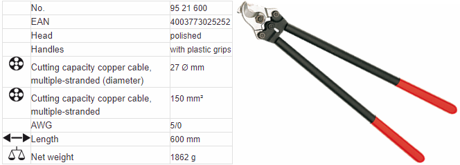 - Kìm cắt Knipex 95 21 600, Knipex cutting pliers 95 21 600 chuyên dùng để cắt các chi tiết phổ biến trong công nghiệp. Khả năng cắt cắt với dây cáp cáp đồng nhiều sợi Ø 27 mm.