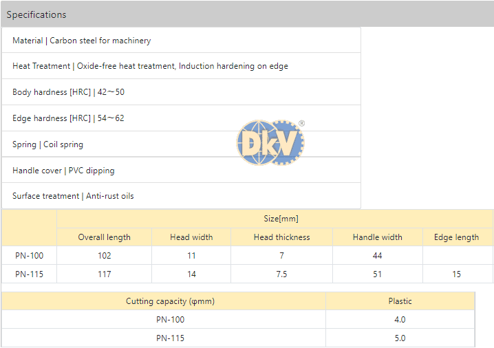• Kìm cắt Tsunoda PN-100, Tsunoda cutting pliers PN-100: với khả năng cắt cắt với dây mềm Ø 4 mm, chiều dài: 102 mm, chuyên dùng để cắt các chi tiết phổ biến trong công nghiệp.