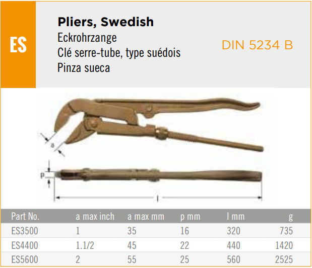 - Kìm ống chống cháy nổ Ampco ES3500, Ampco non sparking pipe plier ES3500 có độ mở max: 1", chiều dài tổng thể 320 mm, chuyên dùng để siết bulong, đai ốc trong môi trường yêu cầu tính phòng chống cháy nổ.
