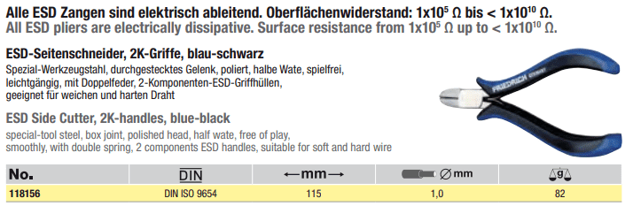 - Kìm cắt chống tĩnh điện Friedrich 118156 được chế tạo theo tiêu chuẩn DIN ISO 9655.