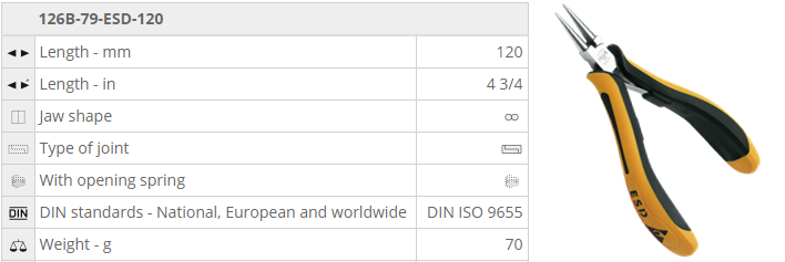 - Kìm mỏ nhọn chống tĩnh điện NWS 126B-79-ESD-120, NWS Round Nose Pliers 126B-79-ESD-120 chuyên dùng để uốn, kẹp... các chi tiết phổ biến trong môi trường có từ tính cao.