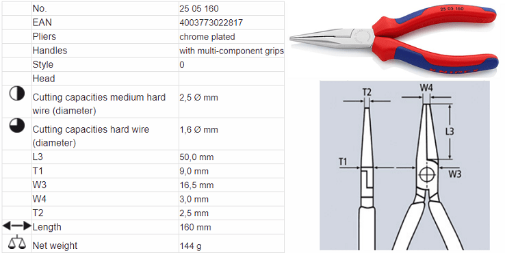 - Kìm mỏ nhọn đa năng Knipex 25 05 160, Knipex snipe nose side cutting pliers 25 05 160 với nhiều ứng dụng: cắt, uốn, kẹp...phổ biến trong công nghiệp. Khả năng cắt với dây cứng Ø 1,6 mm, cắt với dây vừa Ø 2,5 mm.