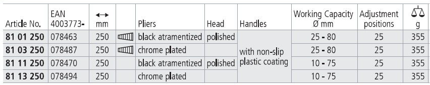 - Kìm mỏ quạ Knipex 81 03 250, kìm ống nước Kinipex 81 03 250, Knipex water pliers 81 03 250 chuyên dùng để siết ống, các chi tiết hình trụ tròn, có độ mở max: 80 mm, chiều dài 250 mm.