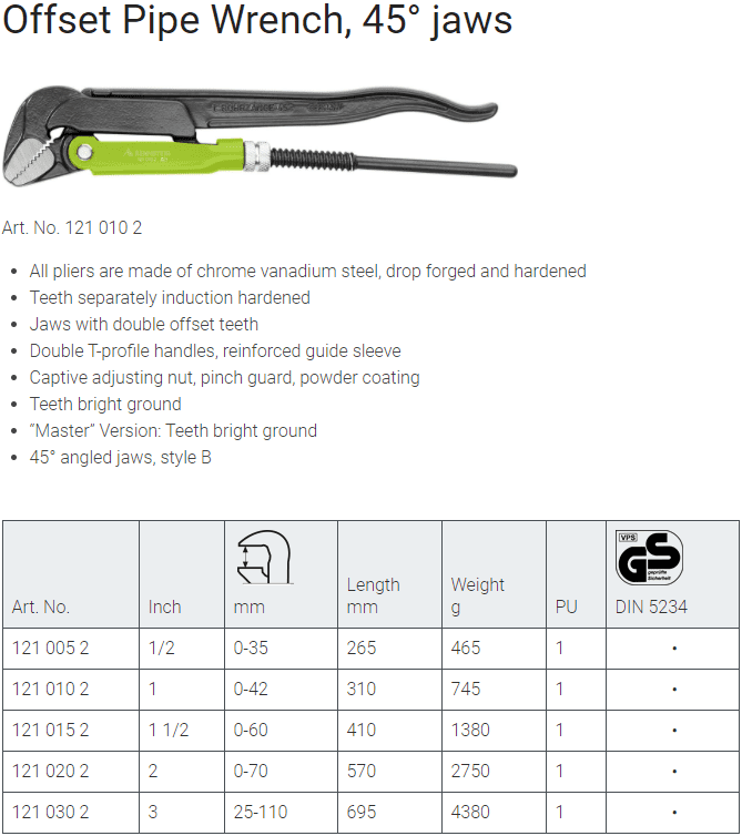 - Kìm ống Rennsteig 121 015 2, mỏ lết ống Rennsteig 121 015 2: chuyên dùng để siết ống, các chi tiết hình trụ tròn, có độ mở max: 60 mm (1-1/2"), chiều dài ban đầu: 410 mm.