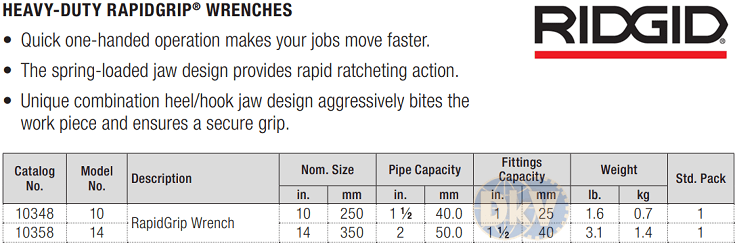 - Kìm ống Ridgid 10348, mỏ lết ống Ridgid 10348: chuyên dùng để siết ống, các chi tiết hình trụ tròn, có độ mở max: 1"(25 mm), chiều dài 10 inch (250 mm).