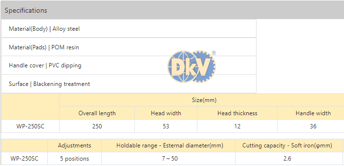- Vật liệu chế tạo của kìm ống Tsunoda WP-250SC bằng thép cường lực, có gia cường ở đầu kìm và thanh ren/con trượt để nâng cao tuổi bền của mỏ lết.