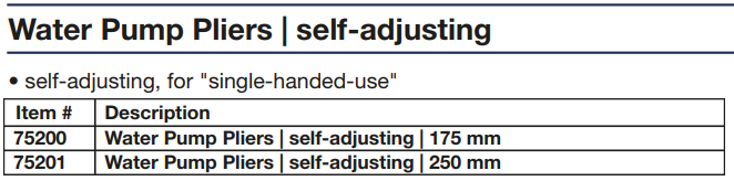 - Mỏ lết răng BGS 75201, mỏ lết ống nước BGS 75201, BGS water pump pliers 75201: chuyên dùng để siết ống, các chi tiết hình trụ tròn, chiều dài: 250 mm.