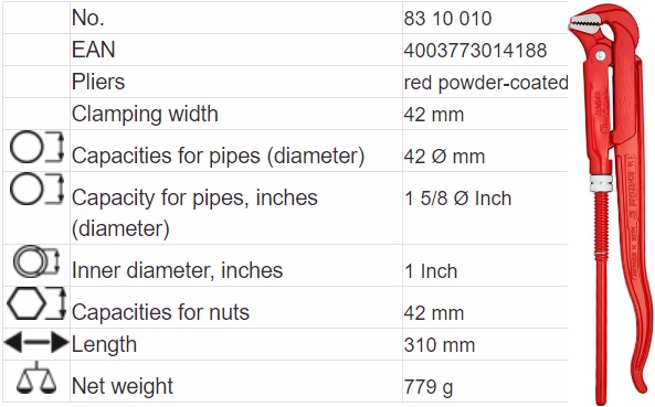- Kìm mỏ quạ Knipex 83 10 010, Knipex pipe wrench 83 10 010 chuyên dùng để siết ống, các chi tiết hình trụ tròn, lục giác... trong công nghiệp, có độ mở max: 42 mm.