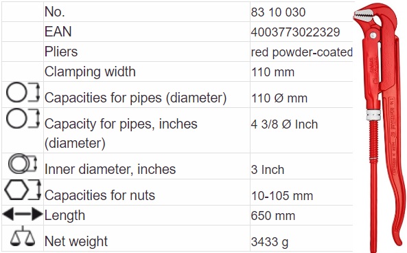 - Kìm mỏ quạ Knipex 83 10 030, Knipex pipe wrench 83 10 030 chuyên dùng để siết ống, các chi tiết hình trụ tròn, lục giác... trong công nghiệp, có độ mở max: 110 mm.