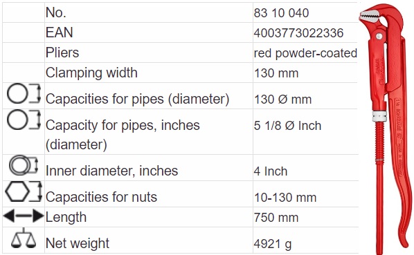 - Kìm mỏ quạ Knipex 83 10 040, Knipex pipe wrench 83 10 040 chuyên dùng để siết ống, các chi tiết hình trụ tròn, lục giác... trong công nghiệp, có độ mở max: 130 mm.