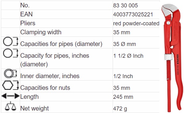 - Kìm mỏ quạ Knipex 83 30 005, Knipex pipe wrench 83 30 005 chuyên dùng để siết ống, các chi tiết hình trụ tròn, lục giác... trong công nghiệp, có độ mở max: 35mm .