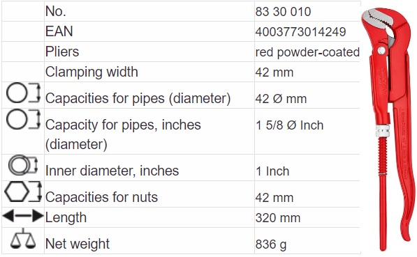 - Kìm mỏ quạ Knipex 83 30 010, Knipex pipe wrench 83 30 010 chuyên dùng để siết ống, các chi tiết hình trụ tròn, lục giác... trong công nghiệp, có độ mở max: 42 mm.
