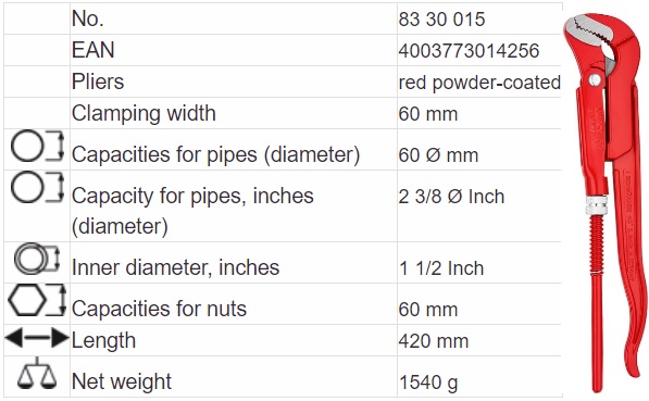 - Kìm mỏ quạ Knipex 83 30 015, Knipex pipe wrench 83 30 015 chuyên dùng để siết ống, các chi tiết hình trụ tròn, lục giác... trong công nghiệp, có độ mở max: 60 mm.