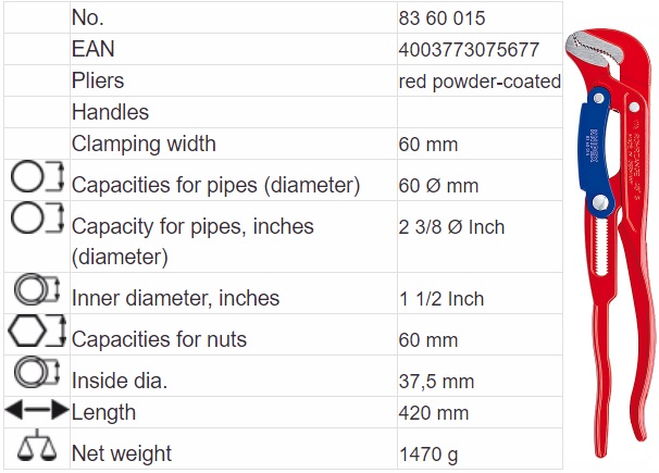 - Kìm mỏ quạ Knipex 83 60 015, Knipex pipe wrench 83 60 015 chuyên dùng để siết ống, các chi tiết hình trụ tròn, lục giác... trong công nghiệp, có độ mở max: 60 mm.