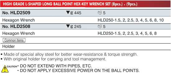 - Bộ lục giác KTC HLD2509 là loại lục giác dạng dài, được chế tạo từ thép trắng (có cơ tính kém hơn loại thép đen). Trọng lượng: 245 g.
