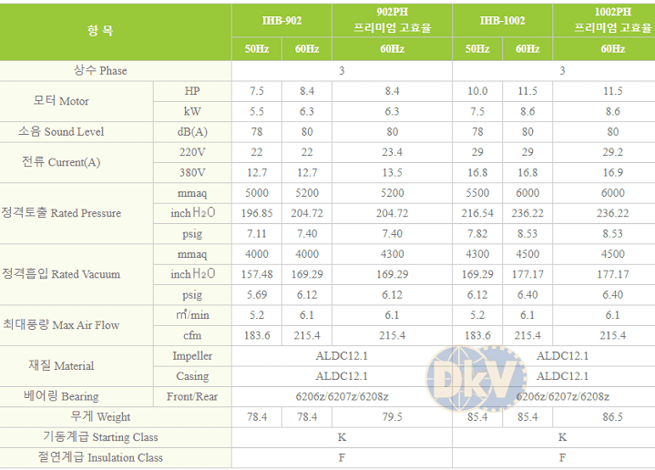 - Máy thổi khí Inha IHB-902, sử dụng động cơ 5.5 kW (7.5 HP)/380V/50Hz/3ph, quấn dây đồng 100%, độ ồn max: 78 dB(A), sẽ giảm tiếng ồn khi lắp thêm ống giảm thanh tại cổ xả khí. Phân cánh quạt và thân vỏ được chế tạo bằng nhôm, giúp nhẹ và thoát nhiệt tốt.