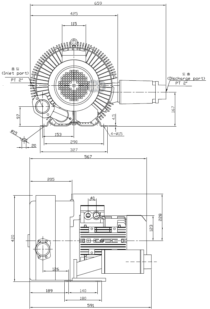 - Cổ hút và cổ xả của máy thổi khí Inha IHB-902 đều có ren size tiêu chuẩn PT 2", thuận tiện khi kết nối với đường ống hoặc các phụ kiện (lọc gió đầu vào, ống giảm thanh, valve chỉnh áp....). Dưới đáy chân đế của máy thổi khí Inha IHB-902 có 4 lỗ khoan Ø 15 mm, thuận tiện khi gá đặt.