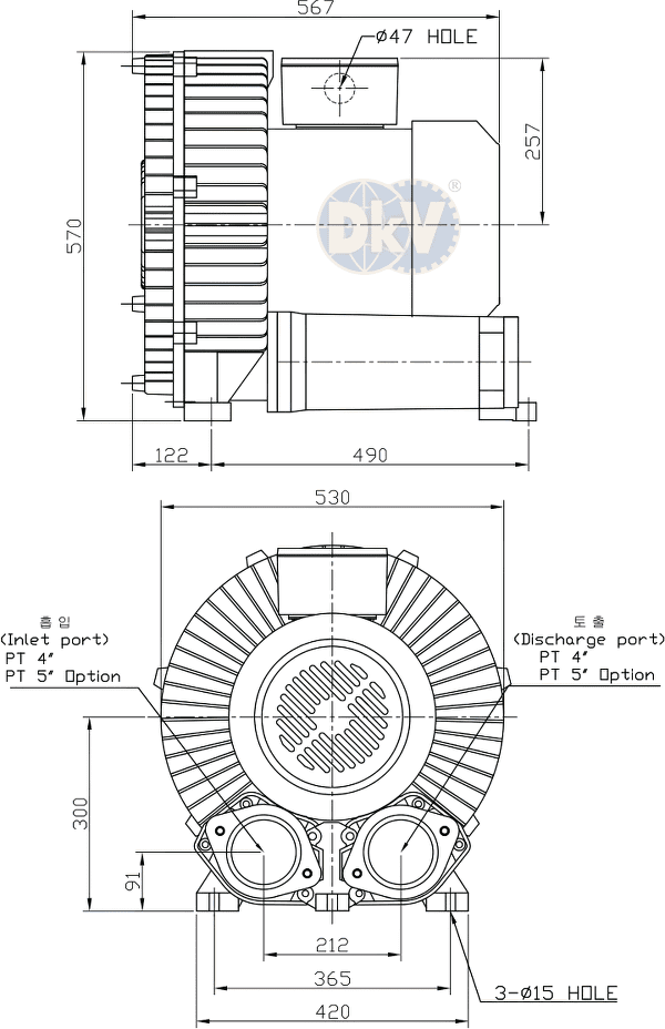 - Cổ hút và cổ xả của máy thổi khí Hwanghae HRB-1110MP đều có ren size tiêu chuẩn PT 3", thuận tiện khi kết nối với đường ống hoặc các phụ kiện (lọc gió đầu vào, ống giảm thanh, valve chỉnh áp....). Dưới đáy chân đế của máy thổi khí Hwanghae HRB-1110MP có 4 lỗ khoan Ø 15 mm, thuận tiện khi gá đặt.