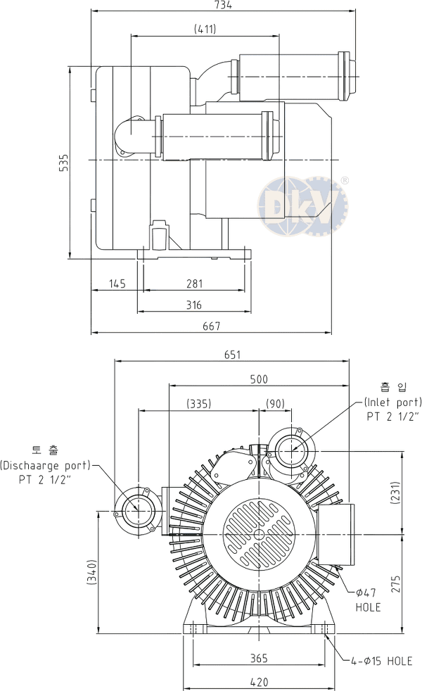 - Cổ hút và cổ xả của máy thổi khí Hwanghae HRB-1202MP đều có ren size tiêu chuẩn PT 2-1/2", thuận tiện khi kết nối với đường ống hoặc các phụ kiện (lọc gió đầu vào, ống giảm thanh, valve chỉnh áp....). Dưới đáy chân đế của máy thổi khí Hwanghae HRB-1202MP có 4 lỗ khoan Ø 15 mm, thuận tiện khi gá đặt.