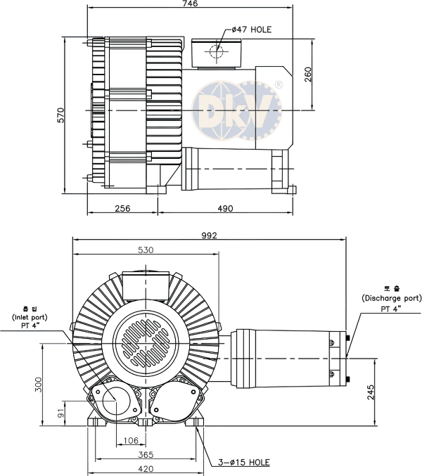 - Cổ hút và cổ xả của máy thổi khí Hwanghae HRB-1302MP đều có ren size tiêu chuẩn PT 4", thuận tiện khi kết nối với đường ống hoặc các phụ kiện (lọc gió đầu vào, ống giảm thanh, valve chỉnh áp....). Dưới đáy chân đế của máy thổi khí Hwanghae HRB-1302MP có 3 lỗ khoan Ø 15 mm, thuận tiện khi gá đặt.