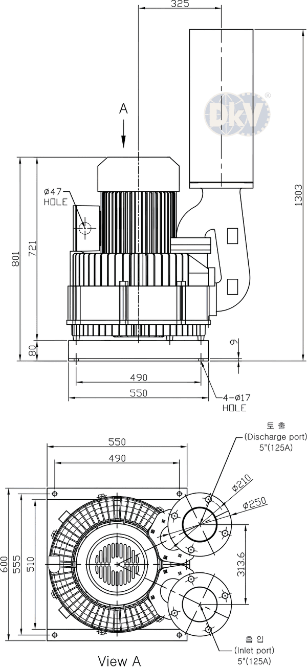 - Cổ hút và cổ xả của máy thổi khí Hwanghae HRB-1603 đều có ren size tiêu chuẩn PT 5", thuận tiện khi kết nối với đường ống hoặc các phụ kiện (lọc gió đầu vào, ống giảm thanh, valve chỉnh áp....). Dưới đáy chân đế của máy thổi khí Hwanghae HRB-1603 có 4 lỗ khoan Ø 17 mm, thuận tiện khi gá đặt.